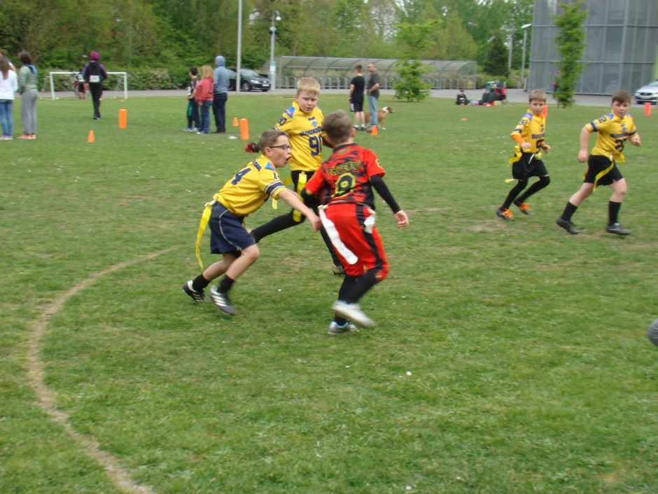 The Cadet teams final game was a re-match with the Phoenix. This was a thrilling game of offence and defence from both sides. The Phoenix took the lead early but the HoundDogs came back with a short run from Morgan Scott-Brundle to tie the game. The HoundDogs then managed to stop the Phoenix and ran the ball back to within yards of the end zone. QB Hayden Puttick then made two fantastic throws into the corner of the endzone, both times picking out Ben Boorer, but both passes just failed to be held on. The Phoenix then ran the ball down the other end to take the score. It was Morgan again, who then completed another 30 yard run to score again for the HoundDogs to tie the game once more at 12-12. The Phoenix then failed to make much ground with their next set of downs. This left the HoundDogs with less than a minute on the clock to score and register their first ever win. A Ben Boorer run got the team within 15 meters of the endzone, and on the last play of the game, Morgan ran the ball and crossed the line. Unfortunately, he had been tackled just short of the endzone to leave the game tied up at 12 all.